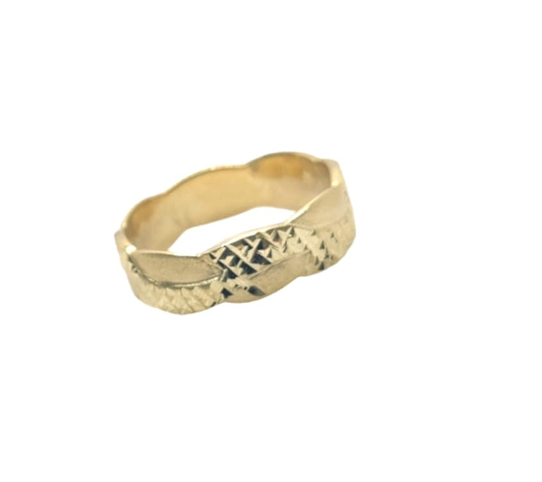 טבעת נישואין מעוצבת בקווים גליים עדינים, המעניקים לה תחושת תנועה טבעית. במרכז הטבעת מופיע אזור מחורץ בדוגמה גיאומטרית עמוקה, היוצר ניגוד בין מרקם מבריק לאזורים מט מסביבו. העיצוב משדר אלגנטיות אורגנית – שילוב בין עדינות צורנית לעיטור מודגש וייחודי.