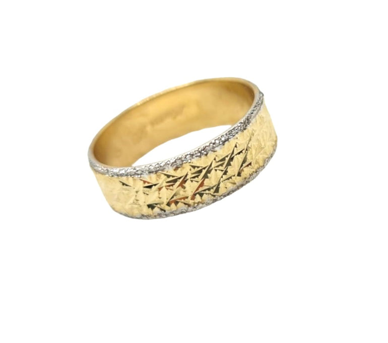 טבעת נישואין רחבה עם טקסטורת לייזר גיאומטרית ושוליים מבריקים | זהב צהוב 14 קראט | דגם הדר