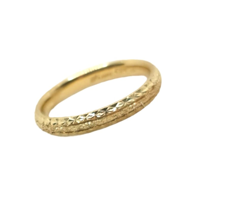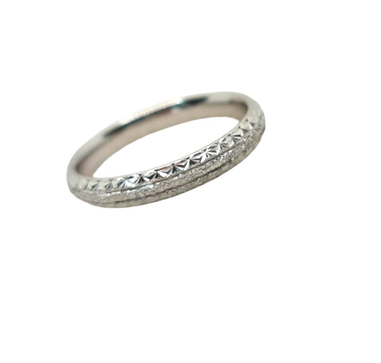 טבעת נישואין עדינה ובעלת נוכחות מחודדת, עם טקסטורת נצנוץ מעודנת העוטפת את גוף הטבעת, ופס חריטה לייזר מרכזי בדוגמה גיאומטרית אחידה. הקונטרסט שבין הברק הרך לבין הפס המעוטר מבליט את הפרטים הקטנים ומשדר איזון בין קלאסיקה לאופי אישי. המבנה הצר והמעוגל הופך אותה לבחירה מושלמת למי שמעדיפה טבעת עדינה אך לא אחידה.