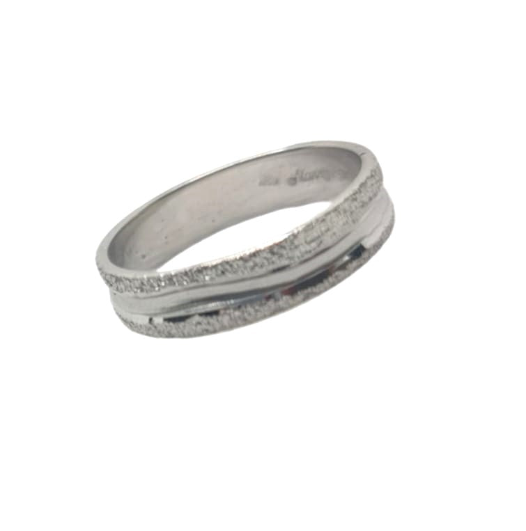 טבעת נישואין בעיצוב אלגנטי ונקי, עם טקסטורת נצנוץ עדינה לאורך החלק העליון, ופס מבריק במרכז הטבעת המעניק לה מראה מודרני ומאוזן. השילוב בין הגימור המט לבין הפס המלוטש יוצר ניגוד חזותי מרשים אך מאופק. הגוון הקריר של הזהב הלבן מדגיש את הברק הטבעי של החומר ומשלים את התחושה היוקרתית.