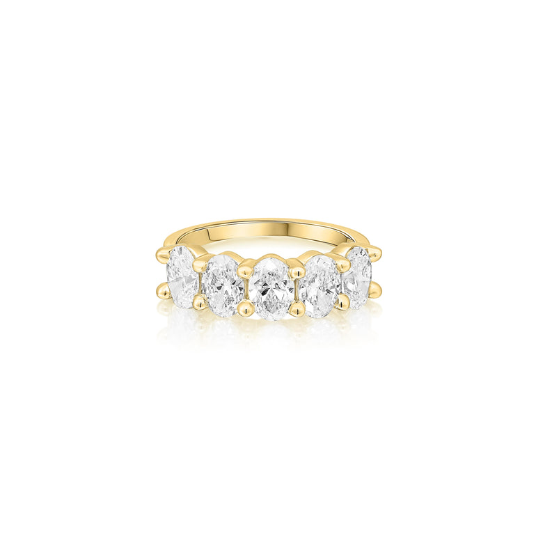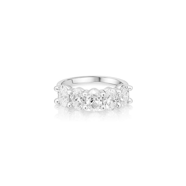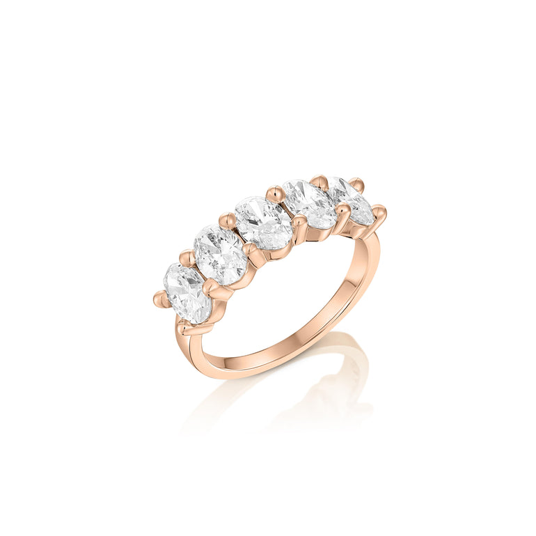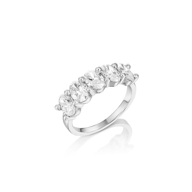 טבעת שורת אבנים יוקרתית עם חמישה יהלומי מעבדה אובאליים מרשימים, המשובצים בטפרים עדינים להדגשת הברק והניצוץ מכל זווית. היהלומים האובאליים יוצרים רצף אלגנטי ומוארך, המשדר יוקרה ואלגנטיות על-זמנית. העיצוב מתאים כטבעת נישואין ייחודית או כטבעת מתנה מרגשת לאירועים בלתי נשכחים. שילוב הזהב הלבן עם יהלומי המעבדה בדרגת צבע EF וניקיון VVS מבטיח מראה זוהר ומרשים במיוחד.