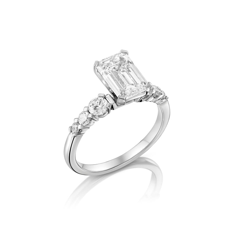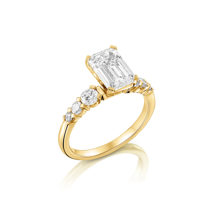 טבעת עוצמתית עם יהלום מרכזי בחיתוך אמרלד במשקל 2.07 קראט, המשובץ בטפרים עדינים המדגישים את צורתו האלגנטית ואת הברק הפנימי המרשים שלו. לצידי האבן המרכזית משובצים שישה יהלומי מעבדה נוספים – שניים גדולים בחיתוך עגול ועוד ארבעה קטנים – במשקל כולל של 0.53 קראט. השילוב בין החיתוכים השונים יוצר איזון מושלם בין יוקרה קלאסית לנוכחות מודרנית, ומעניק לטבעת מראה ייחודי ומרשים במיוחד.
