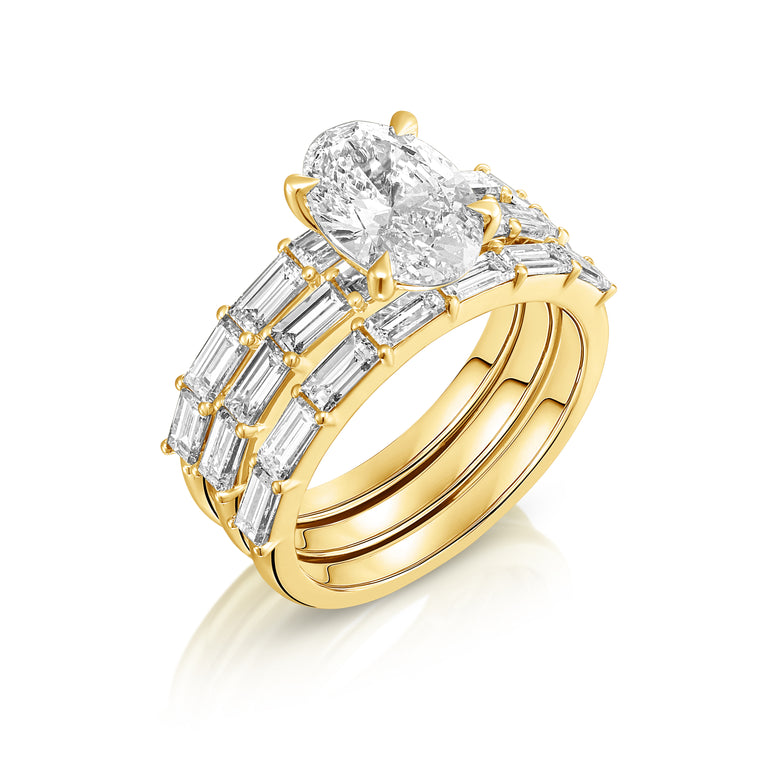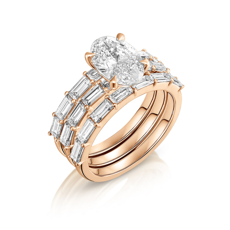 טבעת יוקרתית ומרשימה בעיצוב תלת־שכבתי, עם יהלום מרכזי אובלי במשקל 2.057 קראט ושיבוץ צדדי של עשרים יהלומי באגט נוצצים במשקל כולל של 2.357 קראט. השיבוץ המדורג יוצר מראה עשיר ומואר, המדגיש את היהלום המרכזי ומעניק לטבעת נוכחות עוצמתית ומראה אלגנטי ויוקרתי במיוחד.