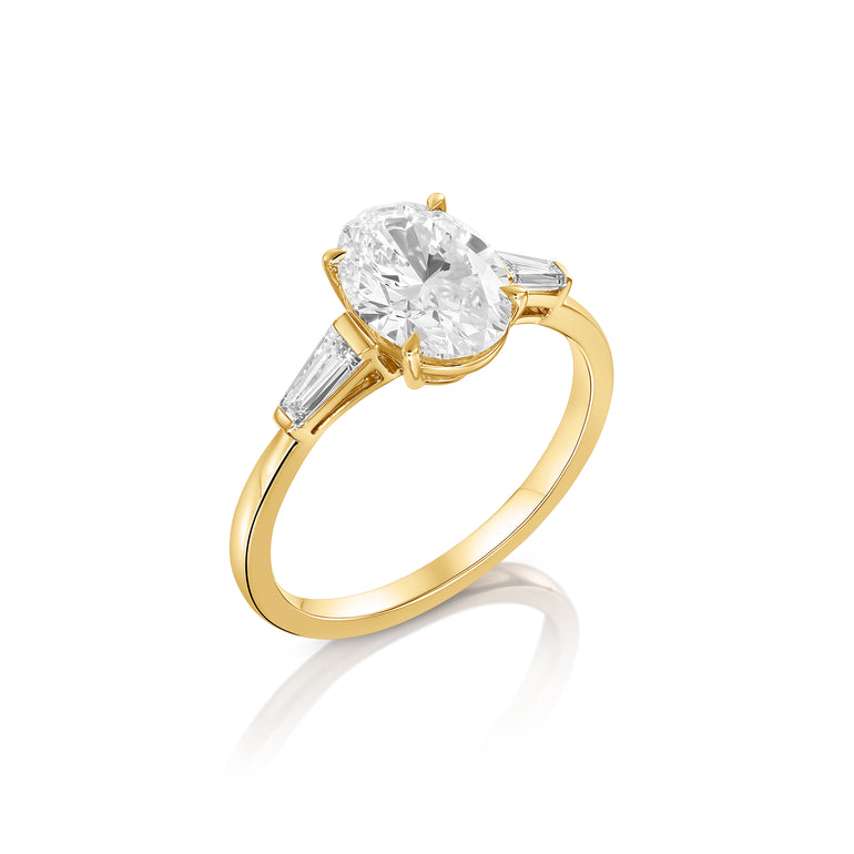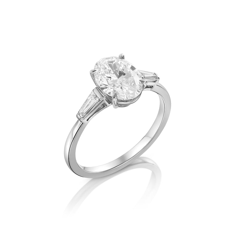 טבעת סוליטר קלאסית ומרשימה בעיצוב תלת אבני, עם יהלום מרכזי אובלי במשקל 2.110 קראט ושני יהלומי צד משולשים במשקל כולל של 0.360 קראט. השיבוץ העדין מדגיש את הברק הטבעי של היהלומים באיכות EF-VVS ומעניק לטבעת מראה אלגנטי ומדויק. טבעת אידיאלית לנשים שמחפשות טבעת נישואין עם נוכחות יוקרתית וקלאסית.