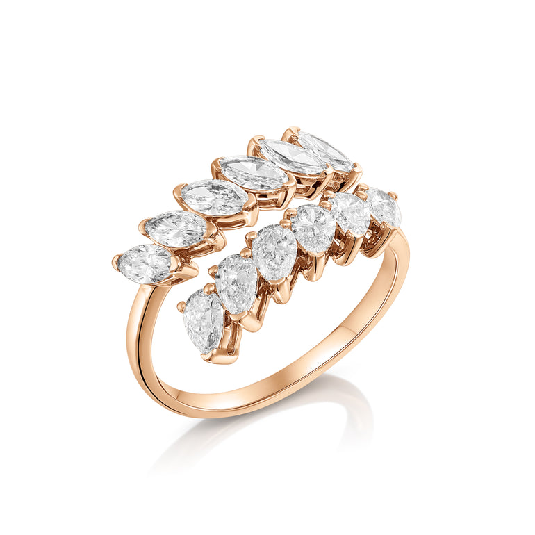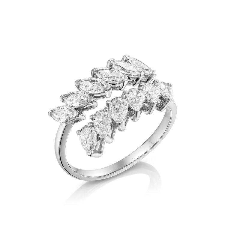 טבעת פתוחה ייחודית בעיצוב מודרני עם שיבוץ כפול של יהלומים בצורות מרקיז וטיפה, היוצרים יחד קומפוזיציה הרמונית ונוצצת במיוחד. היהלומים המשובצים באיכות EF-VVS מעניקים ברק עוצמתי וניקיון מרהיב, בעוד שהעיצוב הפתוח מוסיף לטבעת מראה אלגנטי, קליל ובעל נוכחות יוקרתית.