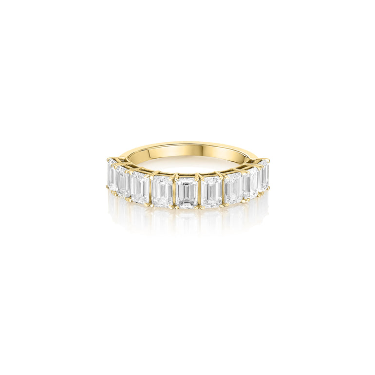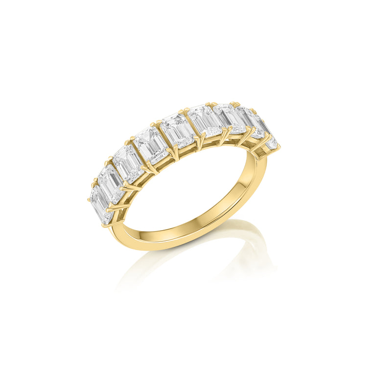 טבעת יוקרתית בעיצוב שורת אבנים מרהיבה, עם תשעה יהלומי מעבדה מלוטשים בצורת אמרלד, המשובצים בסידור סימטרי מוקפד. היהלומים מעניקים ברק נקי וניצוץ ייחודי, ומשווים לטבעת מראה אלגנטי ועוצמתי. העיצוב הקלאסי והיוקרתי הופך את הטבעת לבחירה מושלמת כטבעת נישואין ייחודית או כטבעת מתנה יוקרתית לאירועים חשובים.