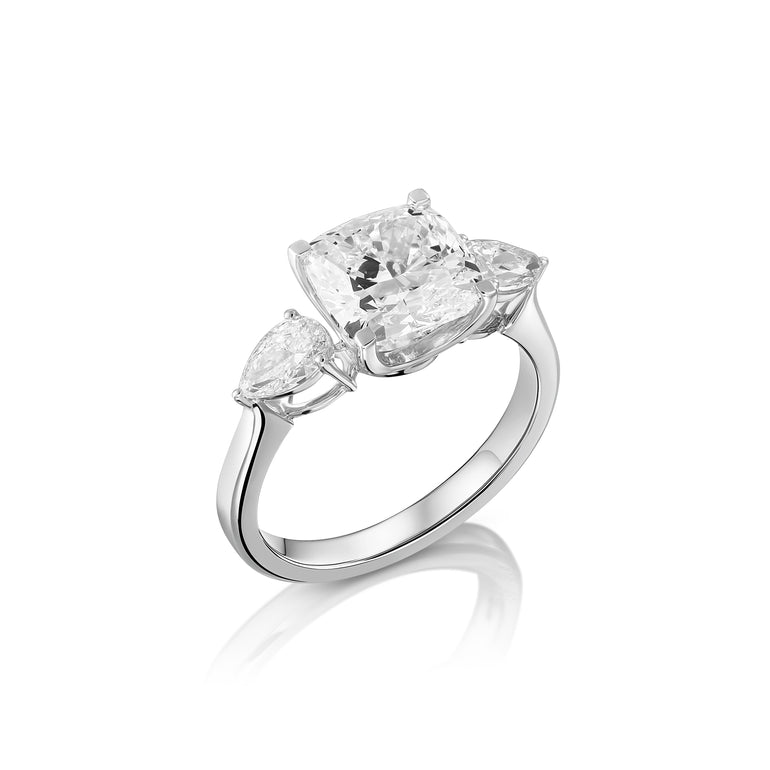 טבעת שלישייה קלאסית ומרהיבה, עם יהלום מרכזי מרשים בחיתוך קושן במשקל 3.29 קראט המשובץ בטפרים עדינים המדגישים את הברק והעומק של האבן. משני צדדי היהלום המרכזי משובצים זוג יהלומי מעבדה בחיתוך טיפה במשקל כולל של 0.649 קראט, המשלימים את העיצוב ומעניקים לטבעת מראה סימטרי, יוקרתי ורומנטי. שילוב הזהב והיהלומים בדרגת צבע EF וניקיון VVS מבטיח מראה עוצר נשימה שמושך את כל המבטים.