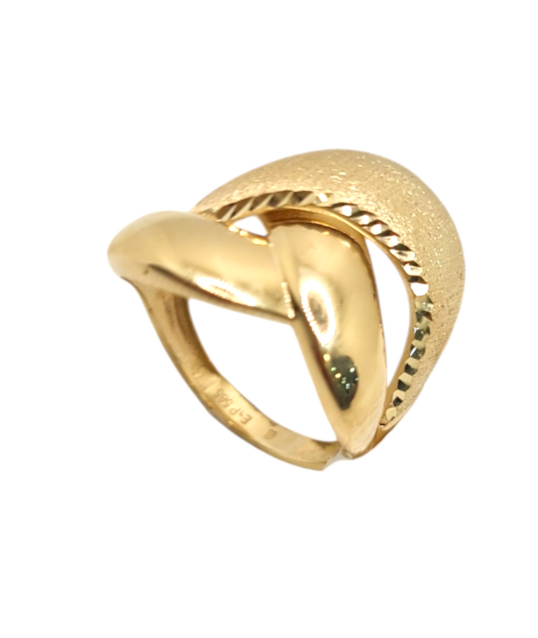 טבעת מעוצבת גבוהה רחבה מבריקה וחלקה משולב מט מנצנץ ופיזור עדין של נצנצים, מזהב צהוב  14 קראט . הטבעת מיוחדת בצורה הייחודית שלה . הטבעת מיוחדת בצורה שלה נותנת  מראה קלאסי ועדין  תכשיט שישדרג לך את המראה מתאים  לכל אישה ולכל אירוע