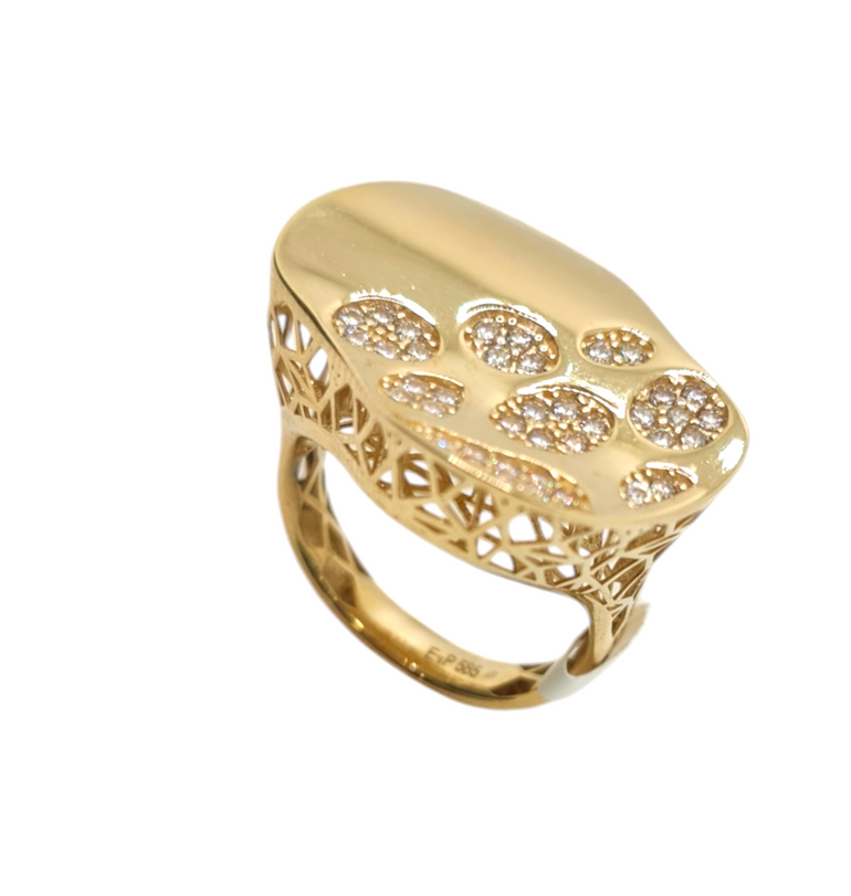 טבעת מעוצבת שטוחה | משולבת מבריק ושיבוץ זרקונים | זהב צהוב 14 קראט | דגם שריי