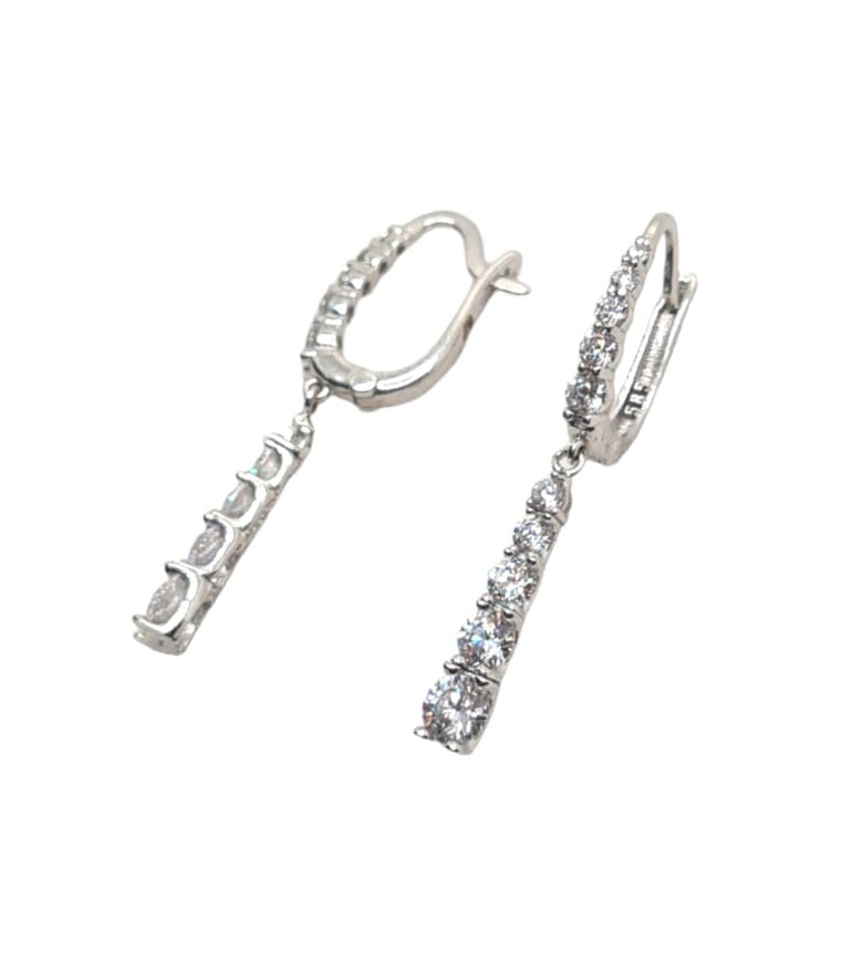 עגילים תלוים נופלים משובצים באבני זרקון נוצצים בזהב לבן משולבים בכמה גדלים של אבנים. העגילים מבריקים ועדינים וקלאסים במראה, בנוסף העגיל מחובר לסוגר אנגלי שגם הוא מובץ באבני זרקון. נותן גם מראה עדין