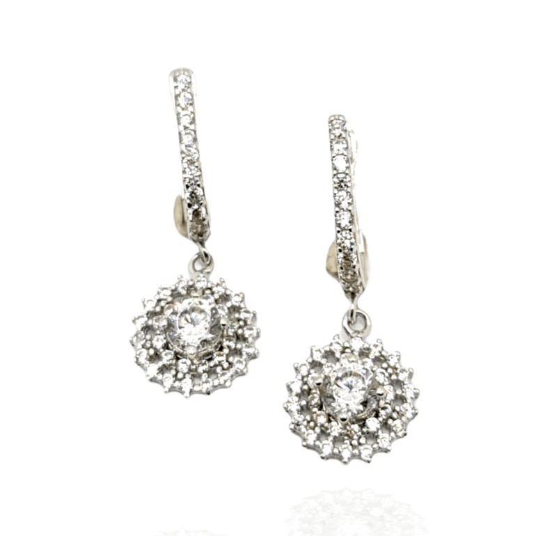 עגילים תלוים חצי חישוק סוגר אנגלי משולבים תלון תלוי בצורת עיגול משובצים אבני זרקון, מזהב לבן 14 קראט, עיצוב העגיל הנופל מיוחד נותן לעגיל מראה נוצץ וזוהר, למראה קלאסי ועדין. העגיל בעל נוכחות גבוהה על האוזן ומתאים לכל הופעה .