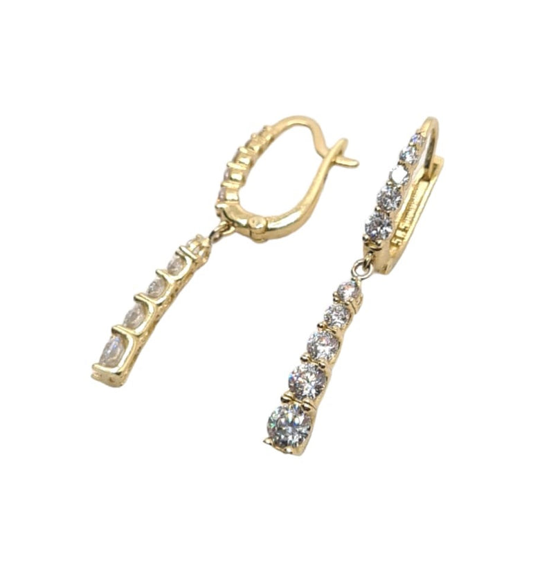 עגילים תלוים נופלים משובצים באבני זרקון נוצצים בזהב צהוב משולבים בכמה גדלים של אבנים. העגילים מבריקים ועדינים וקלאסים במראה, בנוסף העגיל מחובר לסוגר אנגלי שגם הוא מובץ באבני זרקון. נותן גם מראה עדין