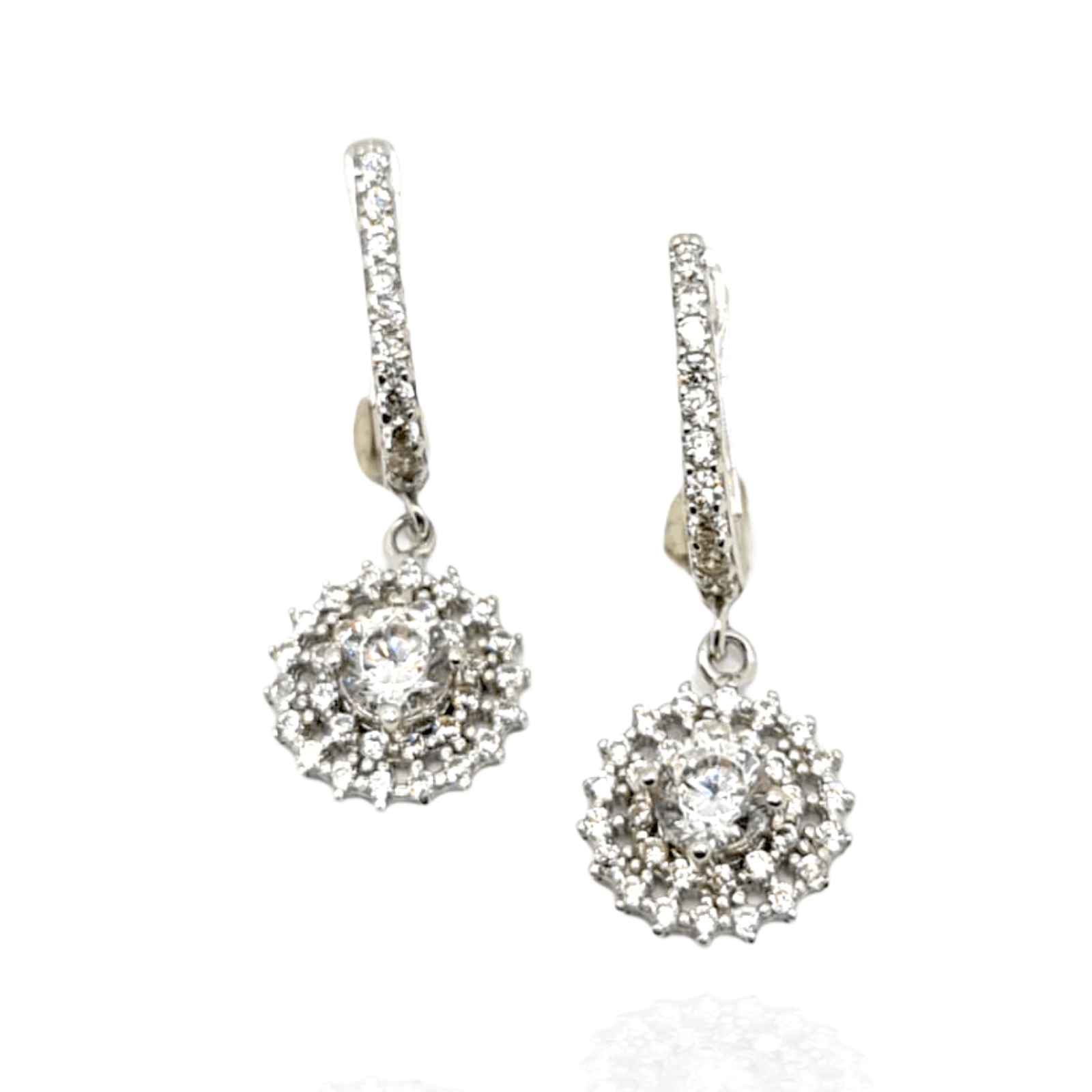 עגילים נופלים | משולבים תליון משובץ אבני זרקון | זהב לבן 14 קראט | דגם ענבל