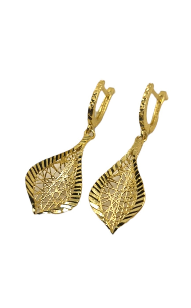 עגילים נופלים בצורת עלה מרושת תחרה, מזהב צהוב 14 קראט, עיצוב העגיל הינו עלה מרושת תחרה משולב חיתוכי לייזר מבריק ונוצץ למרחקים על תופסן העגיל יש חיתוכי לייזר, למראה קלאסי ועדין. העגיל בעל נוכחות גבוהה על האוזן ומתאים לכל הופעה .
