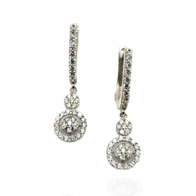 עגילים תלוים חצי חישוק סוגר אנגלי משולבים תליון תלוי בצורת עיגול ועוד עיגול נוסף משובצים אבני זרקון, מזהב לבן 14 קראט, עיצוב העגיל הנופל מיוחד נותן לעגיל מראה נוצץ וזוהר, למראה קלאסי ועדין. העגיל בעל נוכחות גבוהה על האוזן ומתאים לכל הופעה .