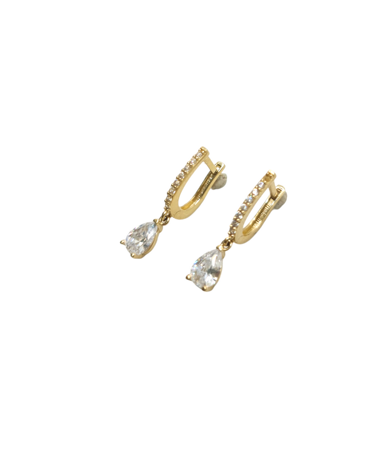 עגילים תלוים נופלים עם סוגר אנגלי הפירסט (תופסן) חלק משובץ אבני זרקון ומחובר לו תליון בצורת טיפה משובץ בזרקון. העגילים נוצצים ומבריקים עדין וקלאסי במראה בנוסף העגיל מחובר לסוגר אנגלי . נותן גם מראה עדין