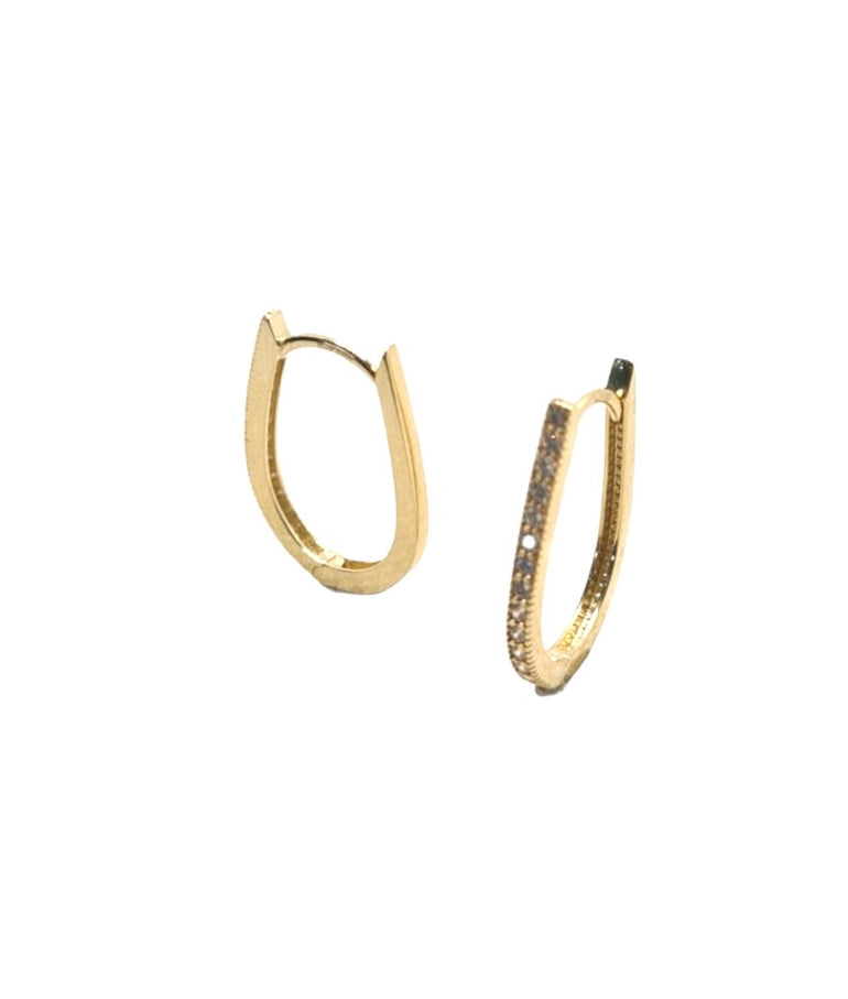 עגילים חישוקים קטנים משובצים באבני זרקון נוצצים בזהב צהוב. העגילים בצורת אליפסה מאוד מיוחדת ומאוד מחמיאה על האוזן. עדינים וקלאסים במראה.