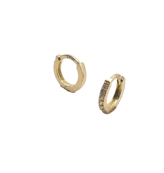 עגילים חישוקים קטנים משובצים באבני זרקון נוצצים בזהב צהוב. העגילים מבריקים ועדינים וקלאסים במראה. נותן גם מראה עדין