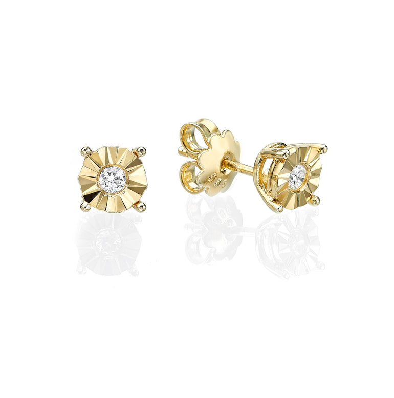 עגילי יהלומים זהב 14 קרט, בעיצוב קלאסי צמוד לאוזן בצורת עיגול משולב חיתוכי לייזר סביב היהלום. העגיל עדין המשובץ יהלום עדין לבן ונוצץ אשר נותן  זוהר וניצוץ ליהלומים שמעניקים לך זוהר לפנייך מכל זווית.