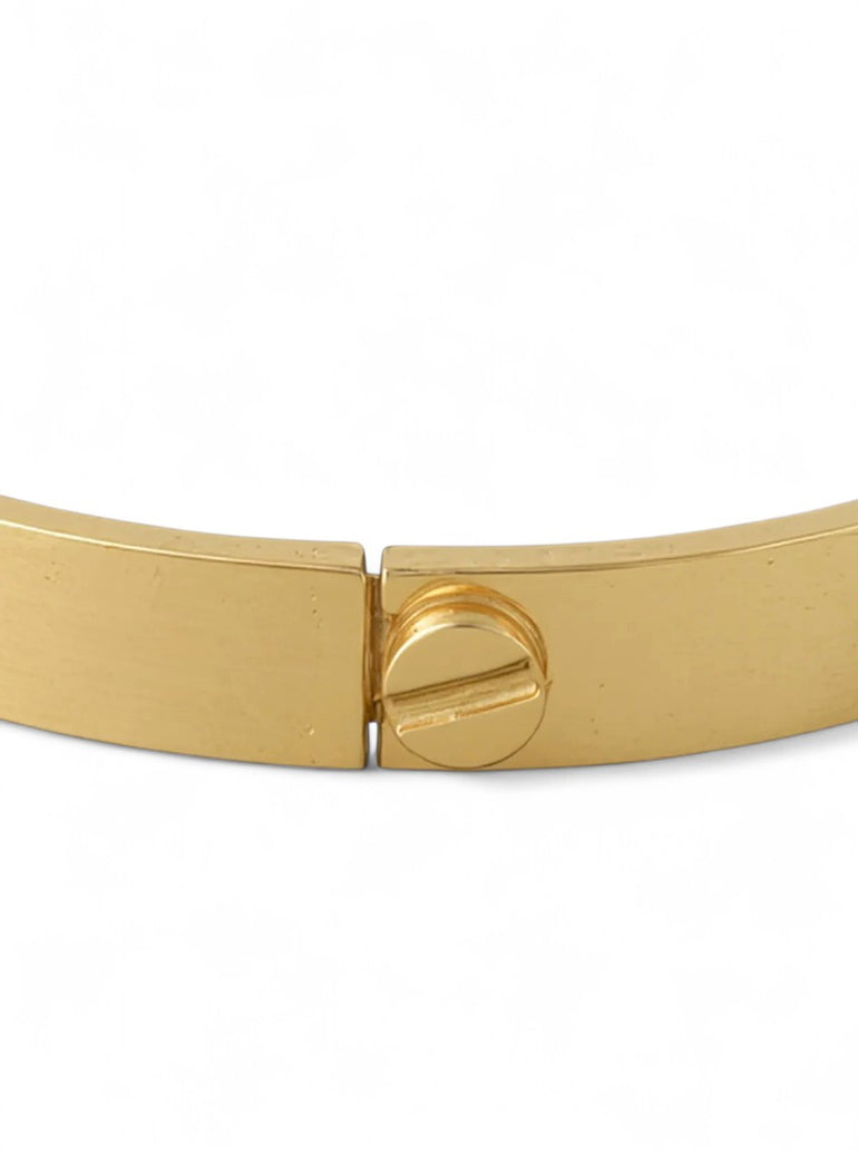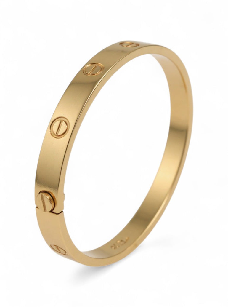 צמיד קשיח במראה יוקרתי, עשוי זהב צהוב 14 קראט, עם חריטות ברגים עיצוביות הפזורות סביב הצמיד. הצמיד נפתח בקלות, נוח ללבישה ומתאים ליום-יום וגם לאירועים. עבודת יד מוקפדת וגימור מבריק להשלמת המראה האלגנטי.