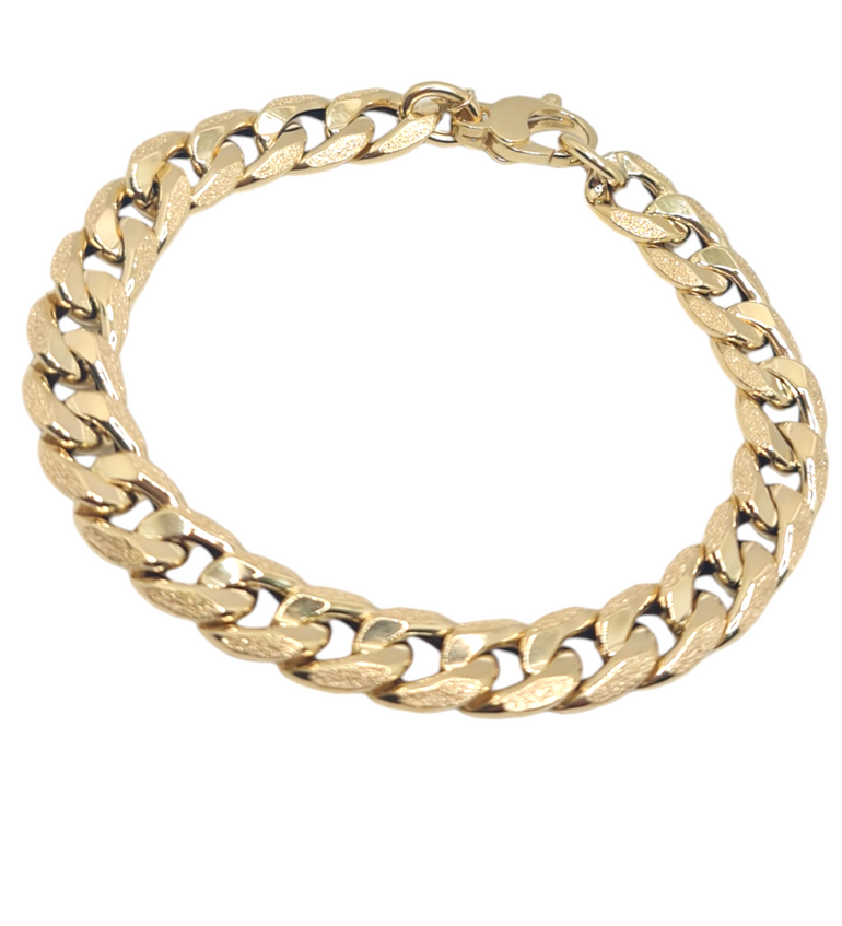 צמיד זהב צהוב 14 קראט בצורת חוליות טיפה רחבות עבות נוצצות ומבריקות,הצמיד חלק ומבריק. הצמיד קלאסי ומתאים לכל יד צמיד שישדרג כל מראה על היד ומתאים לכל הופעה. הצמיד מרשים לגבר אשר ישדרג כל הופעה.
