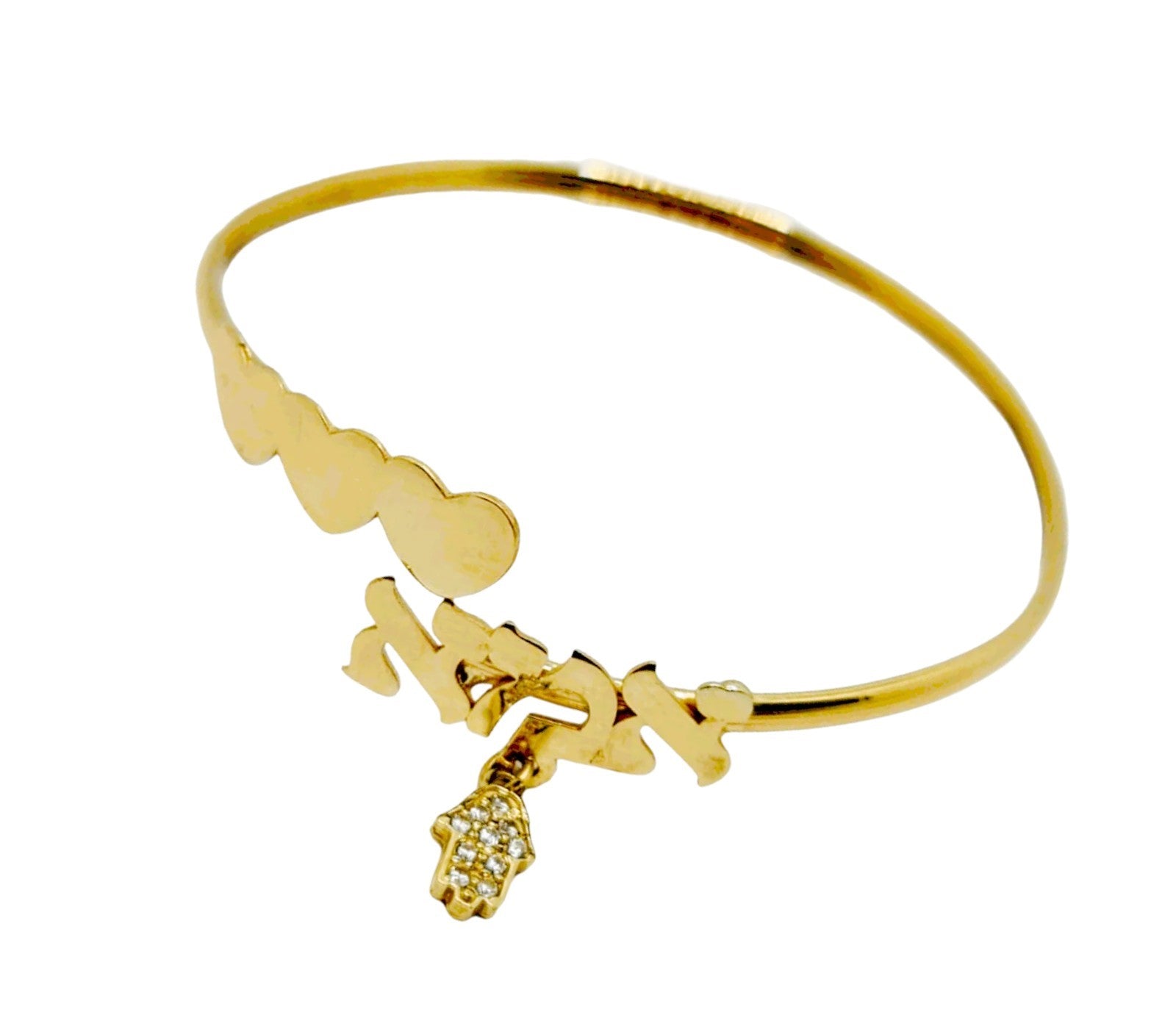 צמיד אובלי קשיח | אמא עם לבבות לחריטה וחמסה | זהב צהוב 14 קראט | דגם אור