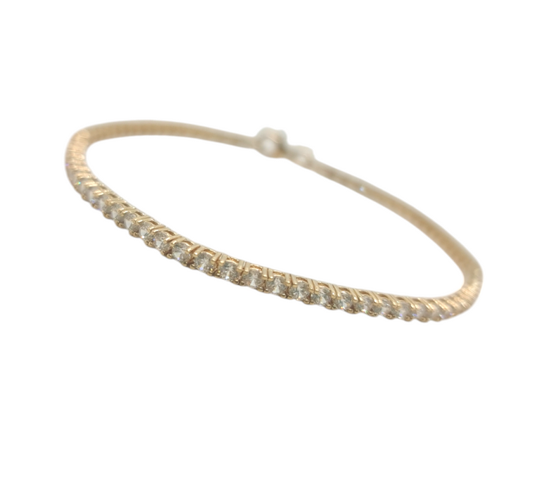 צמיד טניס קלאסי גמיש עדין משובץ זרקונים, טניס זרקונים אשר מדגיש את העדינות של הצמיד. הצמיד משובץ בזרקונים שנראה כמו שיבוץ עדין של יהלומים בנוסף יש לצמיד שיבוץ שיניים שתופסות את האבן בחוזקה ונותנות ביטחון לאבן, בנוסף נותן גם מראה עדין על ידך