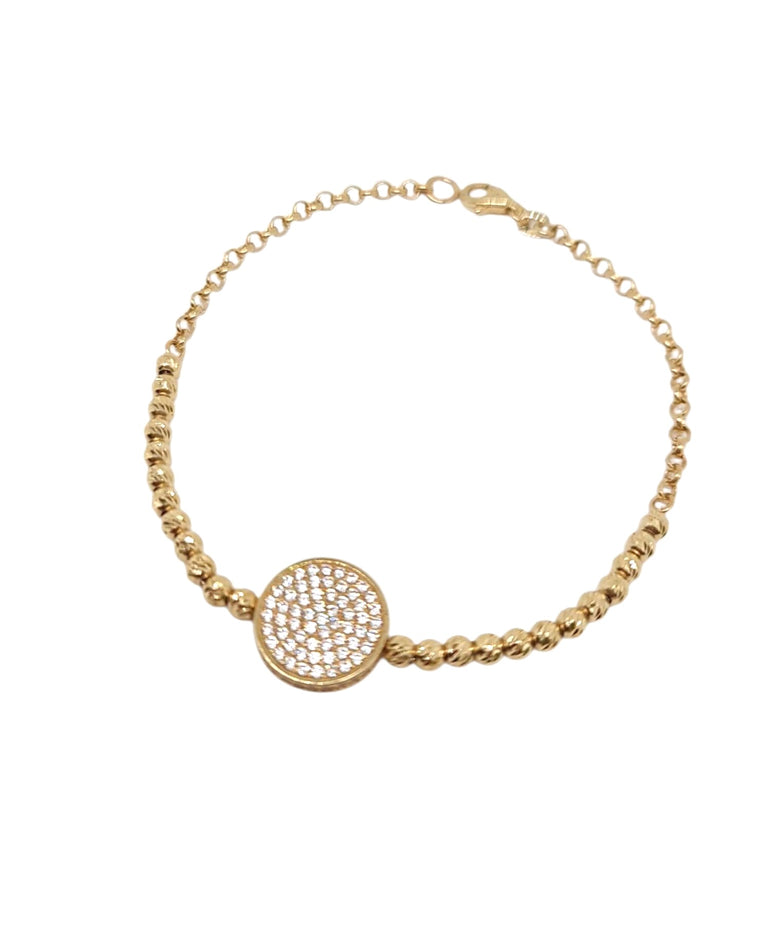 צמיד כדורים עדין |משולב באמצע תליון עגול | משובץ זירקונים | זהב צהוב 14 קראט | דגם רוני