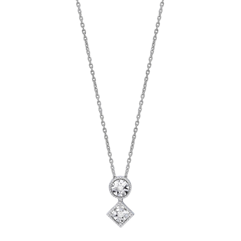 שרשרת יהלומים מורכבת משני תליונים עגול ומעוין מחוברים יחד ומשולבים חתוכי לייזר סביב היהלום. לפנק את האישה בשביל כל אירוע מיוחד אשר יראה לה את אהבתך הנצחית. שרשרת יהלומים זהב אדום\לבן לבחירתך, 14 קראט משובצת 2 יהלומים סה"כ 0.050קראט