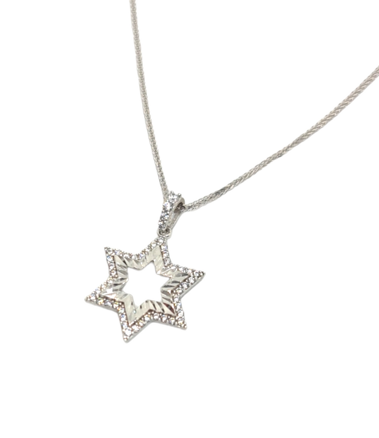 שרשרת ותליון מגן דוד חיצוני משובץ אבני זרקון ופנימי חרוט בחיתוכי לייזר נוצצים ומבריקים, השרשרת מעוצבת בצורה קלאסית בגודל בינוני. בנוסף נותן גם מראה עדין על צווארך