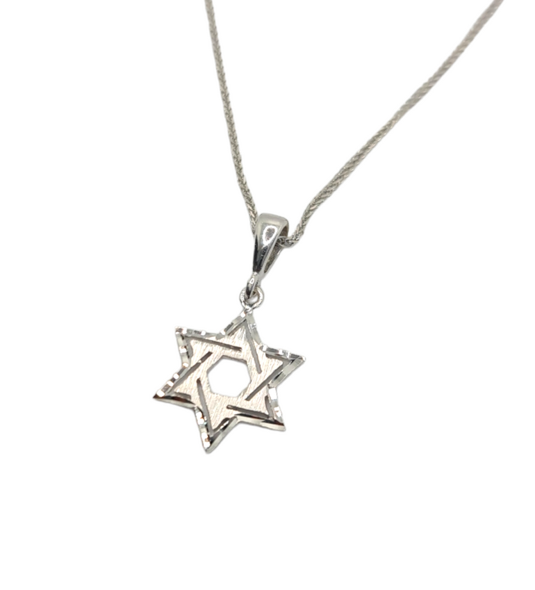 שרשרת ותליון מגן דוד גודל בינוני, המגן דוד קלאסי חרוט בחיתוכי לייזר חיצוני ובחלקו הפנימי מט משופשף. השרשרת מעוצבת בצורה קלאסית. בנוסף נותן גם מראה עדין על צווארך