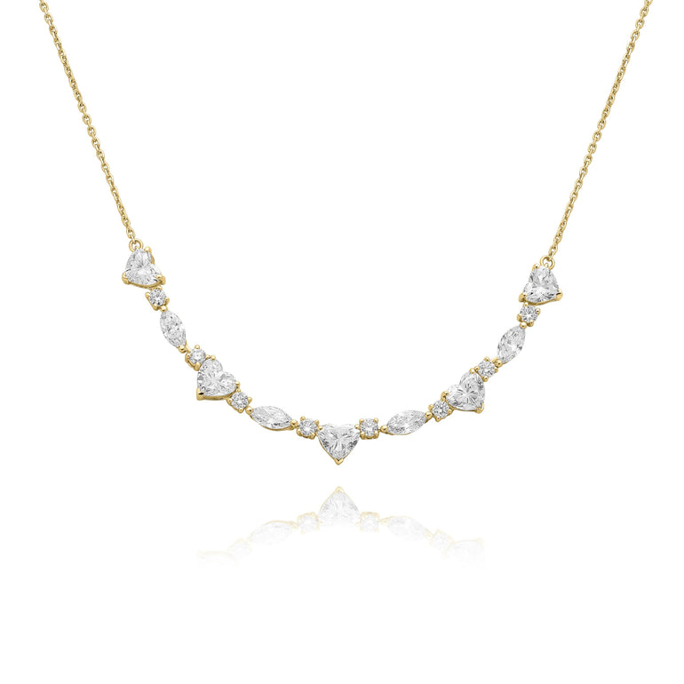 שרשרת יוקרתית בעיצוב משולב של 17 יהלומי מעבדה CVD בצורות מרקיזה, לב וטיפה, המשובצים בקו מדורג היוצר מראה אלגנטי, מרווח ומבריק במיוחד. כל אבן מדורגת בצבע EF ובניקיון VVS, מה שמעניק לשרשרת נוכחות יוקרתית ורמת ברק גבוהה במיוחד. מותאמת למי שמחפשת תכשיט בעל מראה מהודר, נקי ומדליק שמאיר את כל ההופעה.