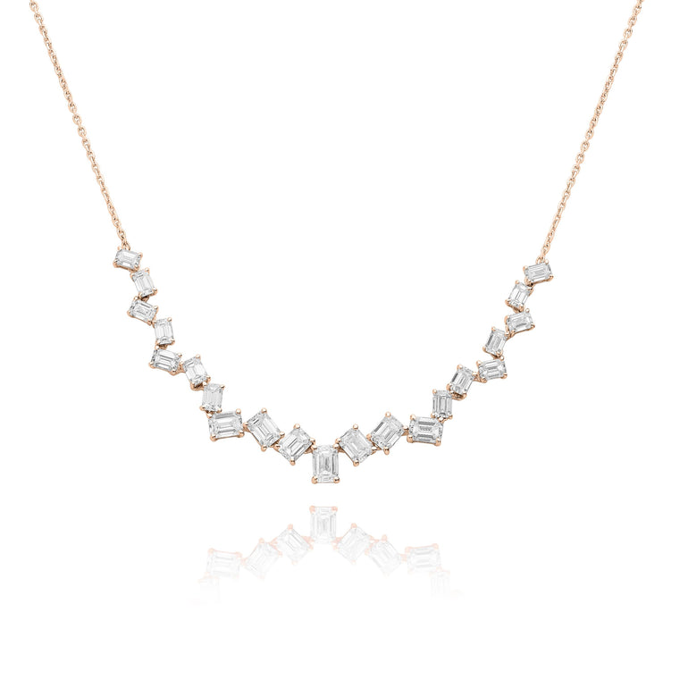 שרשרת יוקרתית בעלת עיצוב ייחודי של יהלומי אמראלד המעוצבים בזוויות משתנות, היוצרות קו אלגנטי ונוצץ סביב מרכז השרשרת. היהלומים באיכות EF-VVS מעניקים ברק גבוה וטוהר מרשים, והאור המשתקף מפאות החיתוך יוצר אפקט מנצנץ ועשיר במיוחד. שילוב מושלם בין עדינות לפרמיום – מתאים למראה ערב נוצץ או לאירועים מיוחדים.