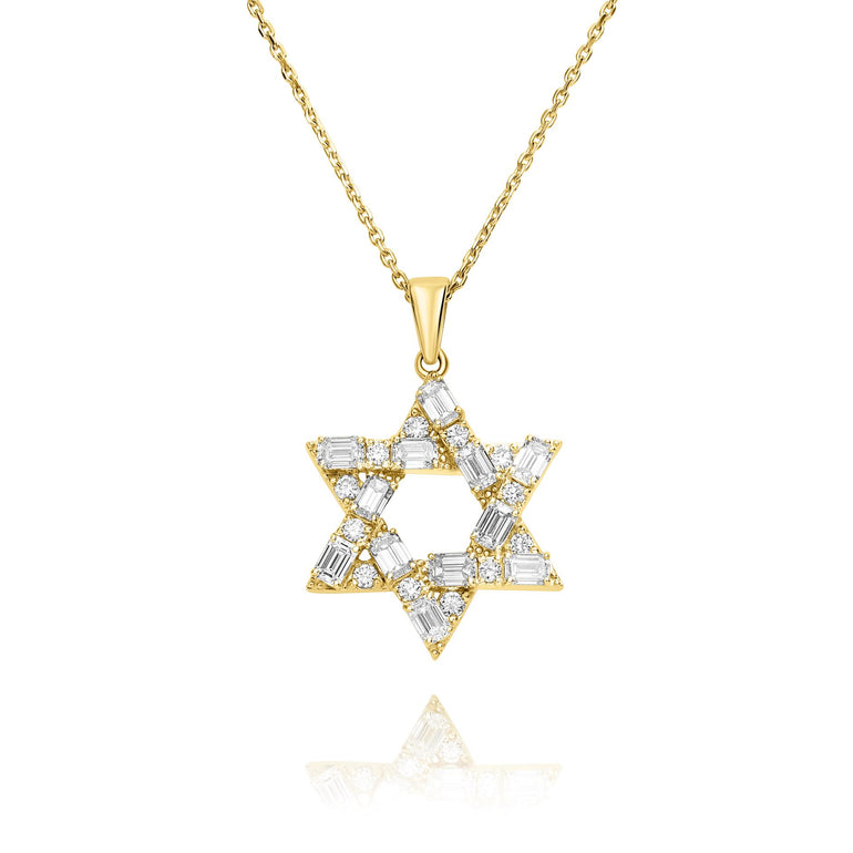 תליון מגן דוד מרהיב בעיצוב גאומטרי יוקרתי, המשובץ בשילוב מדויק של 12 אבני בגט ו־12 אבנים עגולות מיהלומי מעבדה CVD. המבנה המשולב של החיתוכים יוצר עומק, ברק ותנועה אלגנטית בתוך הצורה הקלאסית של המגן. כל היהלומים בדרגת צבע EF ובניקיון VVS, מה שמעניק שקיפות גבוהה וניצוץ חזק ומדויק מכל זווית. תכשיט בעל נוכחות יוקרתית, אלגנטית ומוקפדת — מושלם למי שמחפשת מגן דוד ייחודי ומלא אור.
