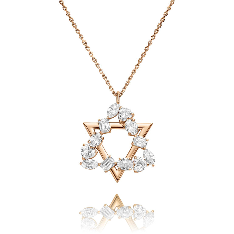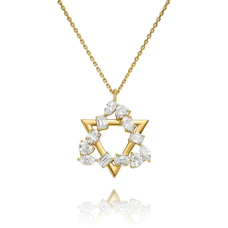 תליון מגן דוד אלגנטי בעיצוב מודרני וחגיגי, המשובץ ב־13 יהלומי מעבדה CVD בצורות מרקיזה, טיפה, עגול ובגט, היוצרים קו חיצוני נוצץ סביב מבנה מגן דוד נקי ומדויק. המשחק בין הצורה הגאומטרית לבין האבנים השונות מעניק לתליון עומק, ברק ונוכחות יוקרתית. כל היהלומים בדרגת צבע EF ובניקיון VVS, המבטיחים שקיפות גבוהה וניצוץ מרשים מכל זווית. תכשיט יוצא דופן למי שמחפשת מגן דוד בעיצוב יוקרתי ומוקפד עם נראות מודרנית.