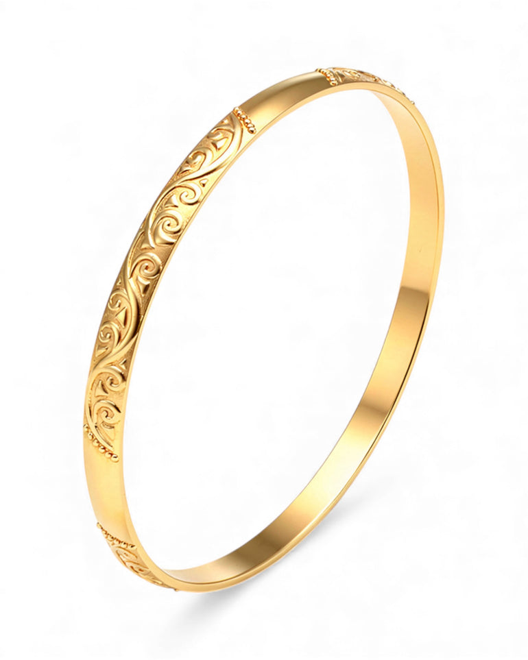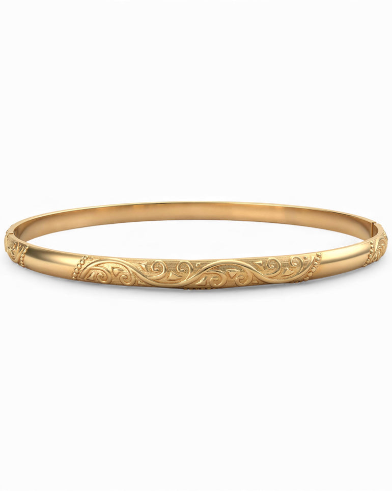 צמיד זהב לילדות בעיצוב מרוקאי עדין, עם תבליטים מפותלים ועבודת חריטה שמעניקה עומק וטקסטורה מרהיבה. הדוגמה המעוגלת משתלבת בצורה אלגנטית על פני הצמיד הקשיח, ויוצרת מראה יוקרתי אך עדין המתאים במיוחד ליד קטנה. הגימור המבריק והקווים המסורתיים מעניקים לצמיד נוכחות מיוחדת — בחירה מושלמת לילדות שאוהבות תכשיטים עם אופי וסטייל.