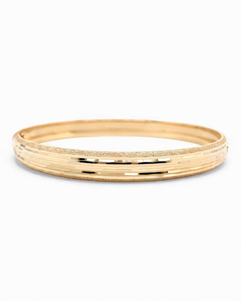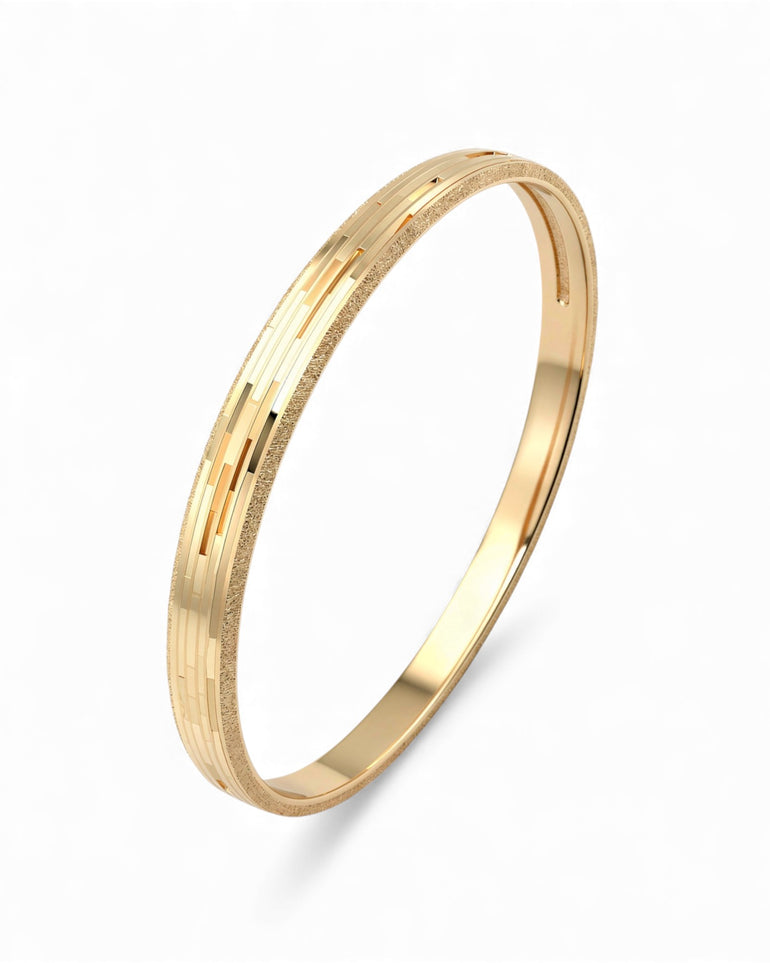 צמיד זהב קשיח לילדות בעיצוב ייחודי המשלב פס עליון מחוספס במראה נצנוץ עדין יחד עם חריטה מבריקה ורב־שכבתית במרכז. המשחק בין המרקם המחוספס לבין הגימור החלק מעניק לצמיד עומק ויוקרה, ויוצר אפקט אור מרשים שמתבלט בכל תנועה. עיצוב זה מתאים במיוחד לילדות שאוהבות תכשיט אלגנטי אך עם טוויסט מעניין ומלא ברק.