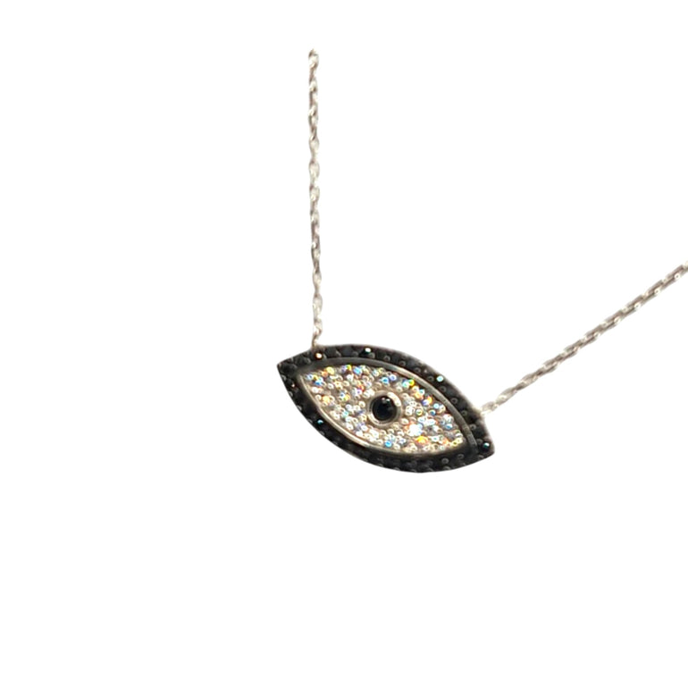 שרשרת עדינה עם תליון בצורת עין משובצת באבני זרקון לבנים וסביב ובאמצע משובץ באבני זרקון שחורות, מזהב לבן 14 קראט . השרשרת מיוחדת בצורה המיוחדת שלה נותנת  מראה קלאסי ועדין  תכשיט שישדרג לך את המראה מתאים  לכל אישה ולכל אירוע