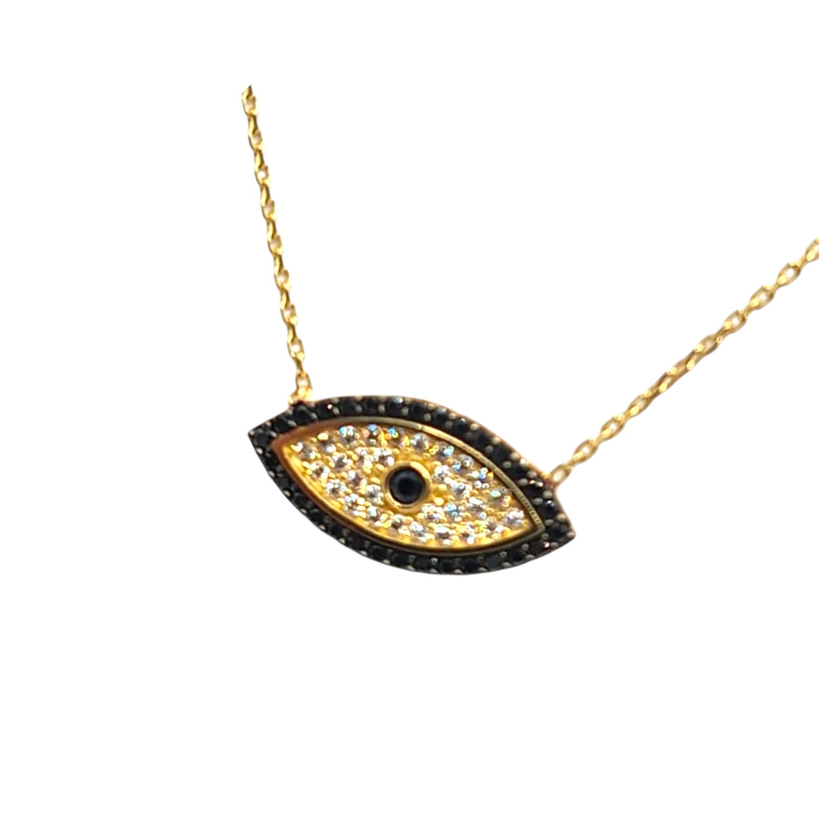 שרשרת ותליון עין | משובצת אבני זרקון לבנות ושחורות | זהב צהוב 14 קראט | דגם קים