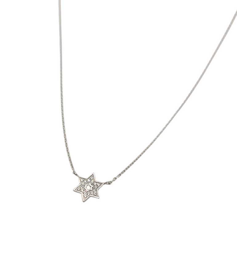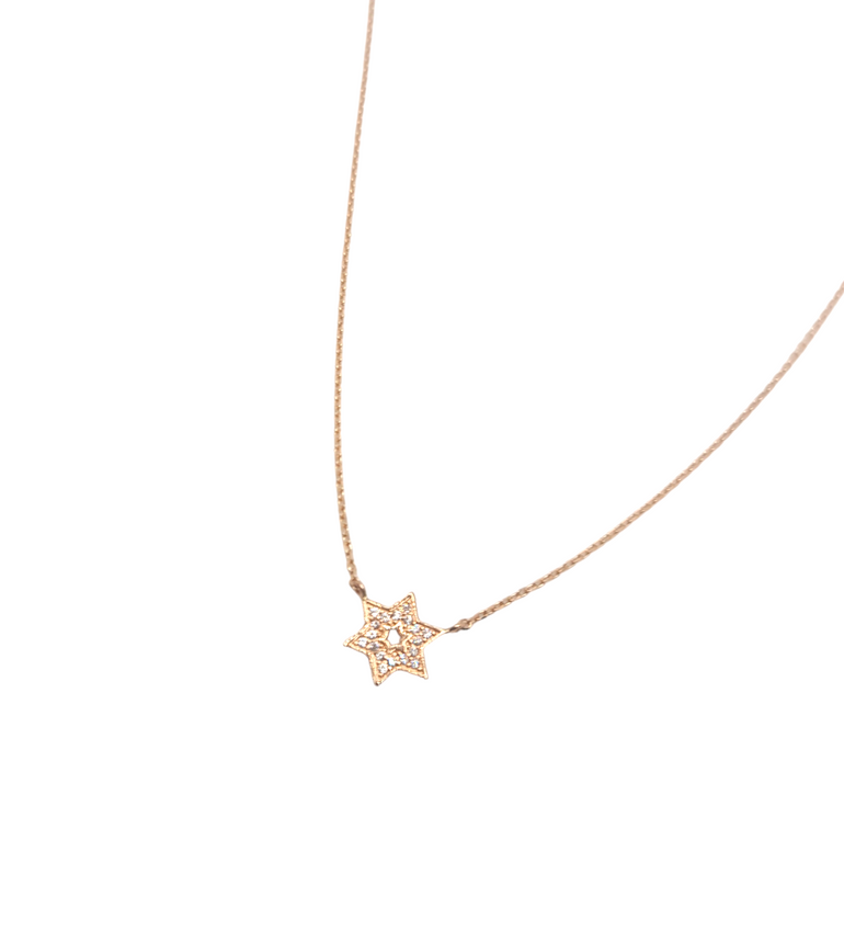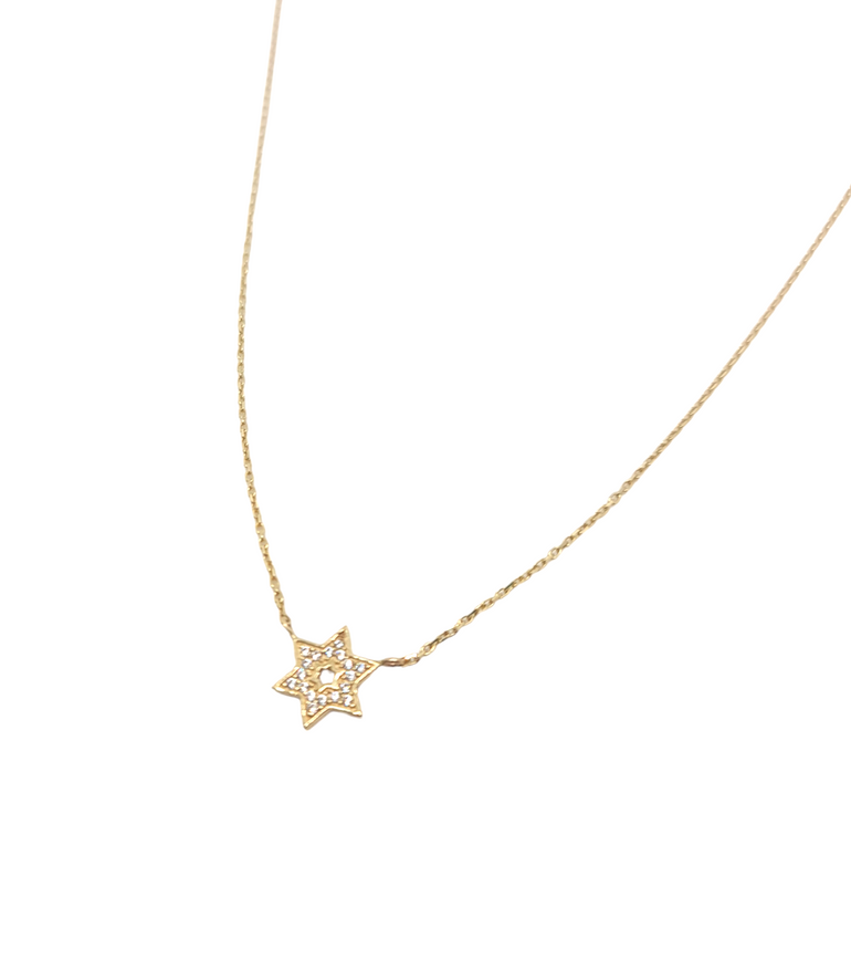 תליון מגן דוד משובץ אבני זרקון קטן עדין וקלאסי מזהב צהוב 14 קראט, השרשרת קלאסית ועדינה. השרשרת מעוצבת בצורה קלאסית , בנוסף נותן גם מראה עדין על צווארך