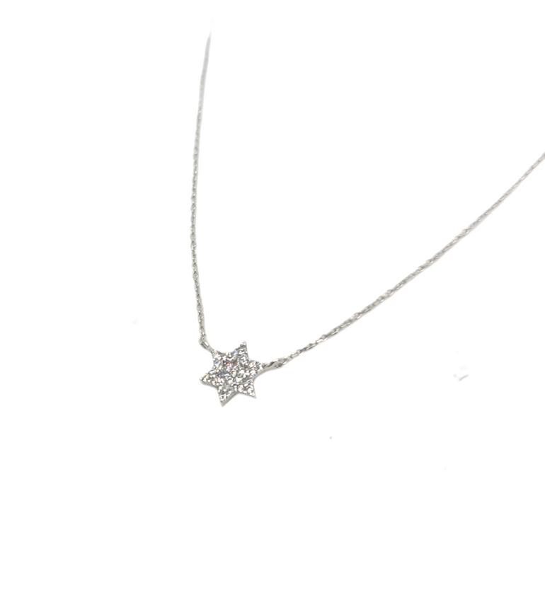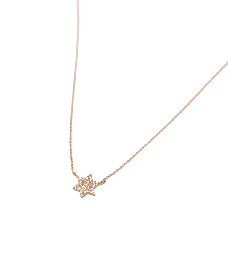 תליון מגן דוד משובץ אבני זרקון קטן עדין וקלאסי מזהב אדום 14 קראט, השרשרת קלאסית ועדינה. השרשרת מעוצבת בצורה קלאסית , בנוסף נותן גם מראה עדין על צווארך