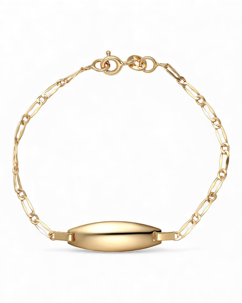 צמיד זהב לילדים בעיצוב קלאסי ונקי, עם לוחית מרכזית אובלית וחלקה המחוברת לשרשרת עדינה וחזקה. העיצוב האלגנטי יושב בנוחות על היד ומתאים במיוחד לילדים וילדות שאוהבים תכשיט עדין, איכותי ובעל משמעות אישית. הלוחית החלקה מעניקה מקום מושלם לחריטה ברורה ומדויקת, והגימור המבריק שומר על מראה יוקרתי לאורך זמן.