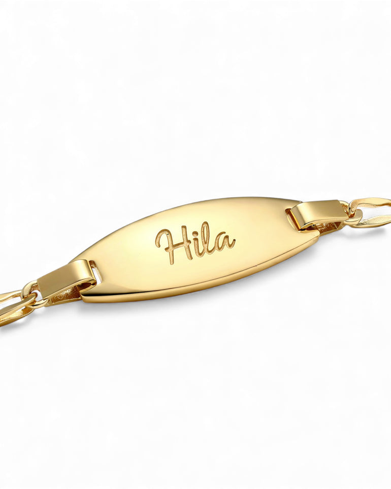 צמיד זהב לילדים | צמיד לחריטה | סגנון פלטה אובלית חלקה עם שרשרת עדינה | זהב צהוב 14 קראט | דגם הילה