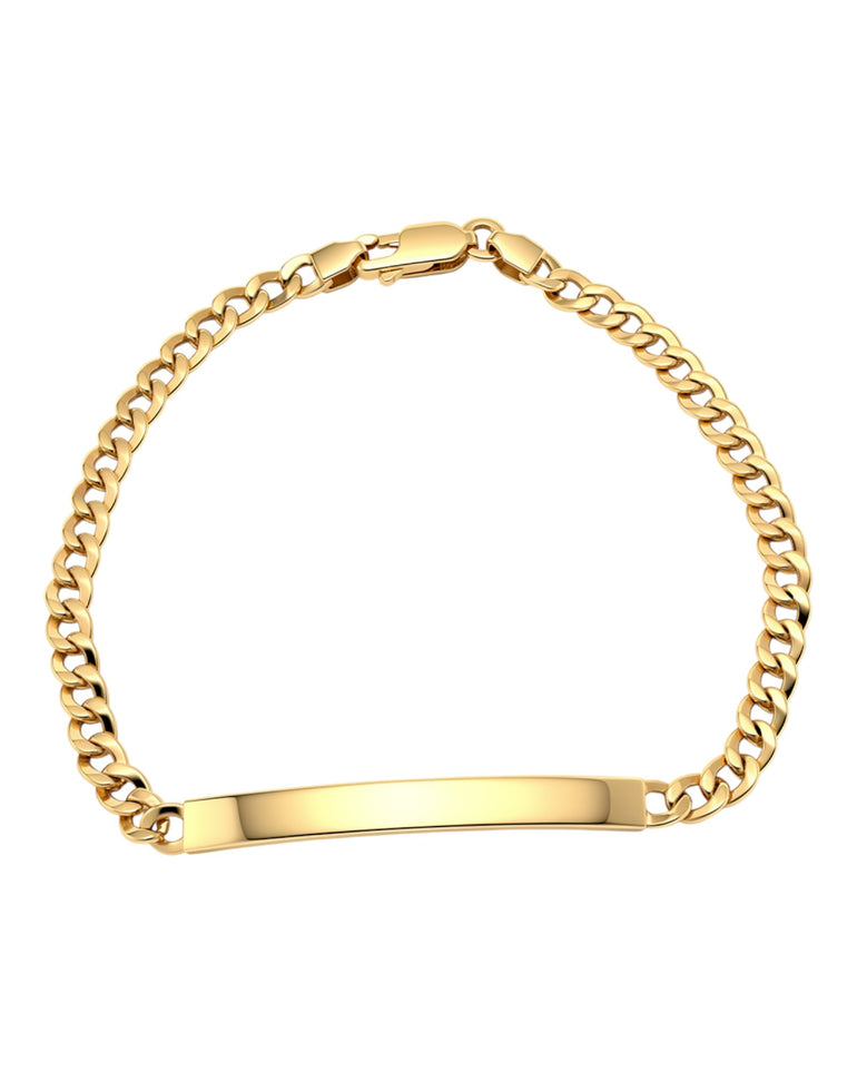 צמיד זהב לילדים בעיצוב קלאסי ונקי, עשוי זהב צהוב 14 קראט. במרכז הצמיד פלטה ישרה וחלקה המיועדת לחריטה, משולבת בשרשרת חוליות קלאסיות וחזקות, המעניקות מראה מכובד ונוח לענידה יומיומית. צמיד זה מתאים במיוחד כמתנה לילד בר מצווה, ומשלב בין עיצוב אלגנטי לערך אישי ומשמעותי.